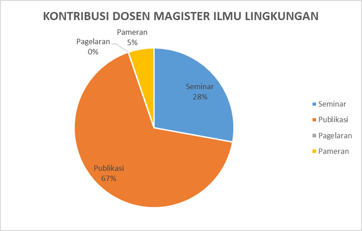 Kontribusi dosen Program Studi Magister Ilmu Lingkungan UPN “Veteran” Jawa Timur dalam kegiatan akademik dan diseminasi hasil penelitian menunjukkan dominasi yang sangat kuat pada bidang publikasi ilmiah, yakni mencapai 67% dari keseluruhan bentuk kontribusi. Hal ini menunjukkan bahwa produktivitas dosen dalam menghasilkan karya ilmiah yang terpublikasi, baik di jurnal nasional terakreditasi maupun jurnal internasional bereputasi, sangat tinggi dan menjadi indikator utama keunggulan penelitian di lingkungan program studi.